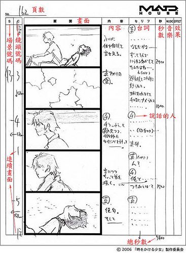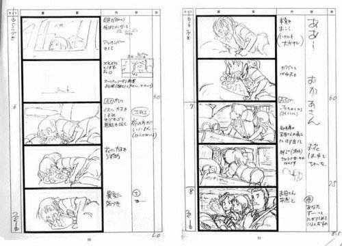 而宫崎骏的这个,是很专业的故事板。女主角在汽车窗探望,然后缩头,然后切换到车内,然后女主角埋下头,然后转头。这种故事板把它拍进电脑里,调整互相的时间间隔,我们就能得到一个能对后面动画很大程度进行安排的一个指导了。