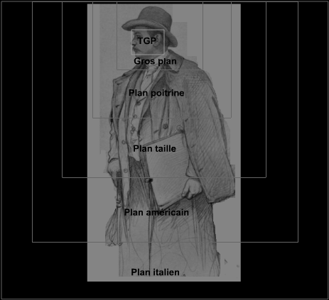 下图是景别示意图,(依次为):大特写、特写、近景、中景、美式中景、意式中景。